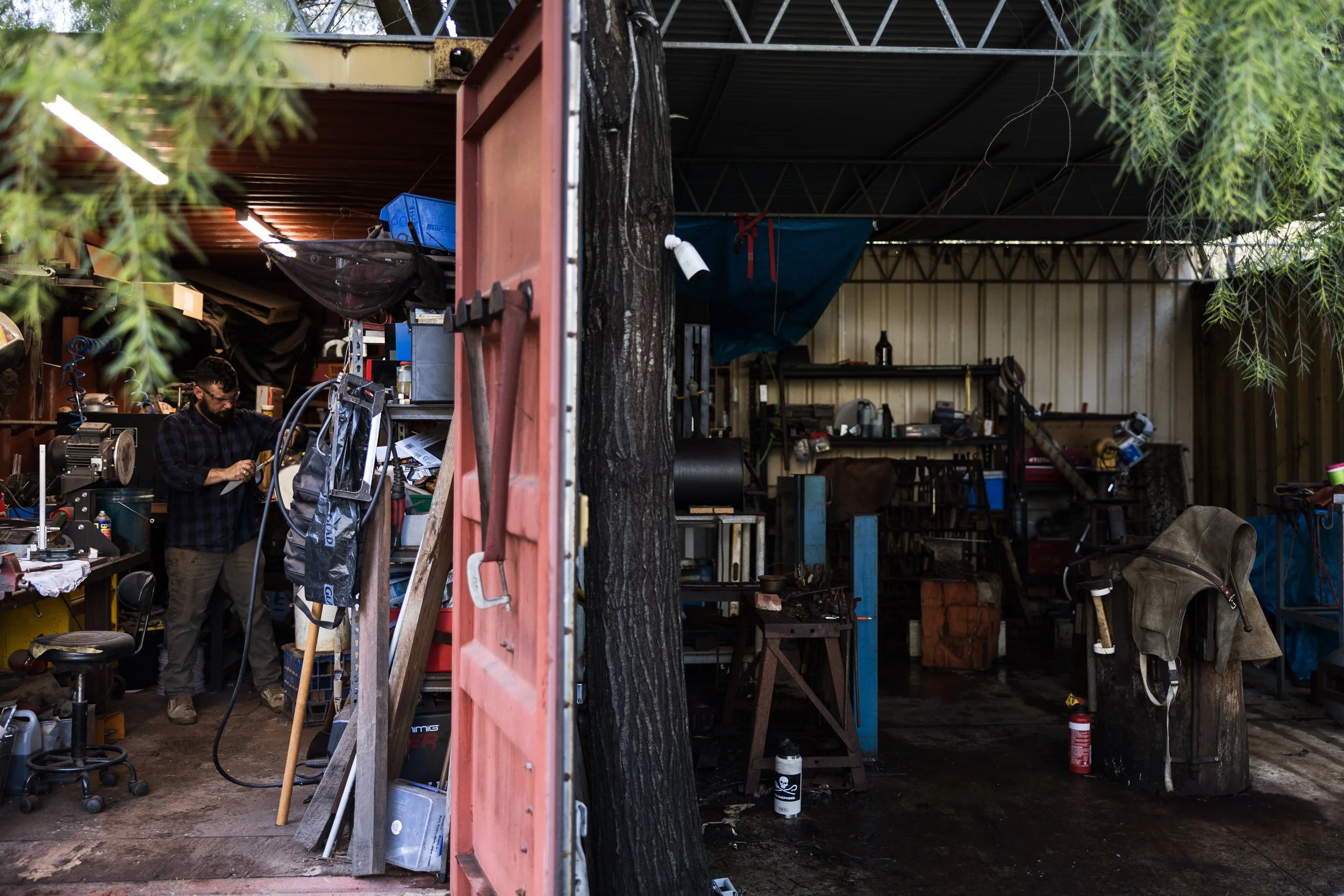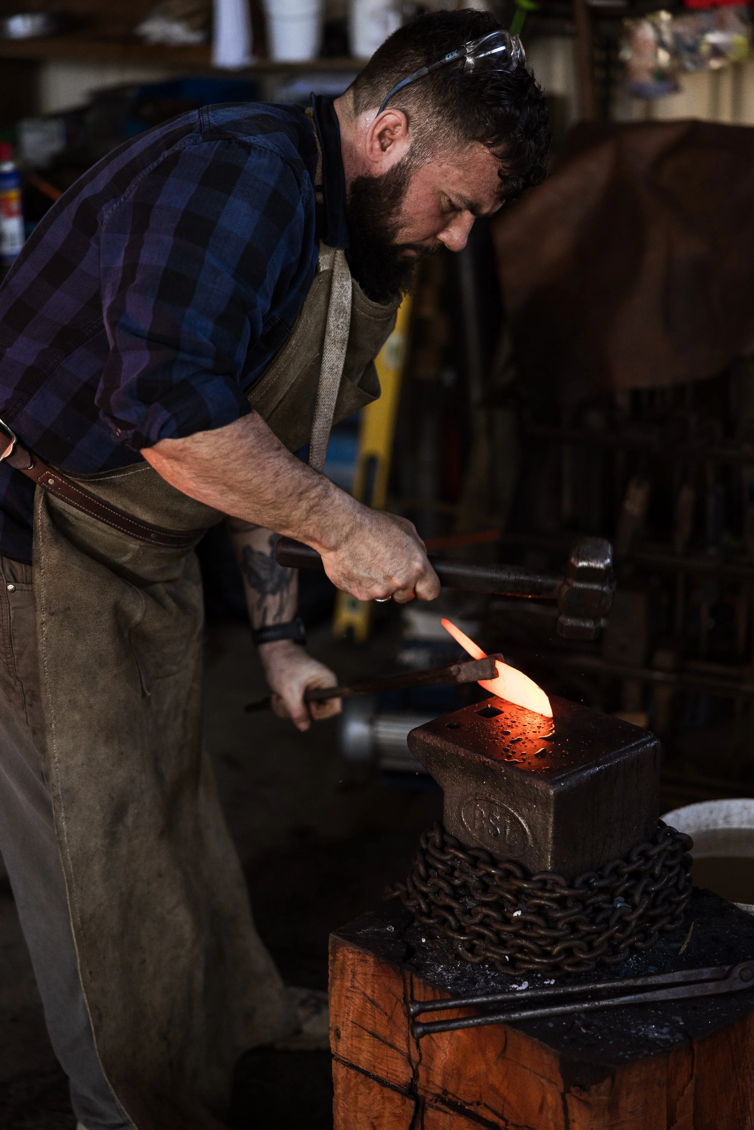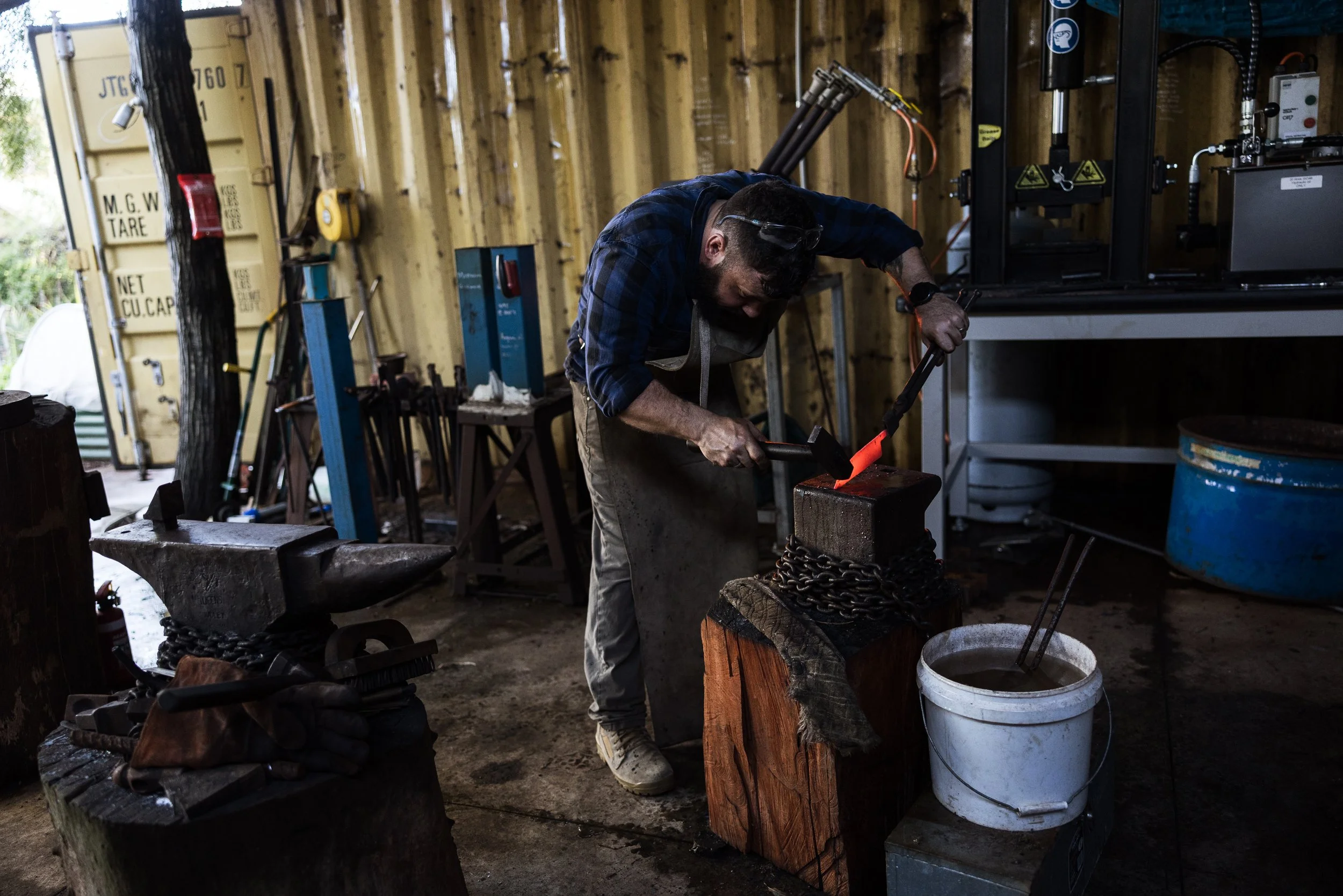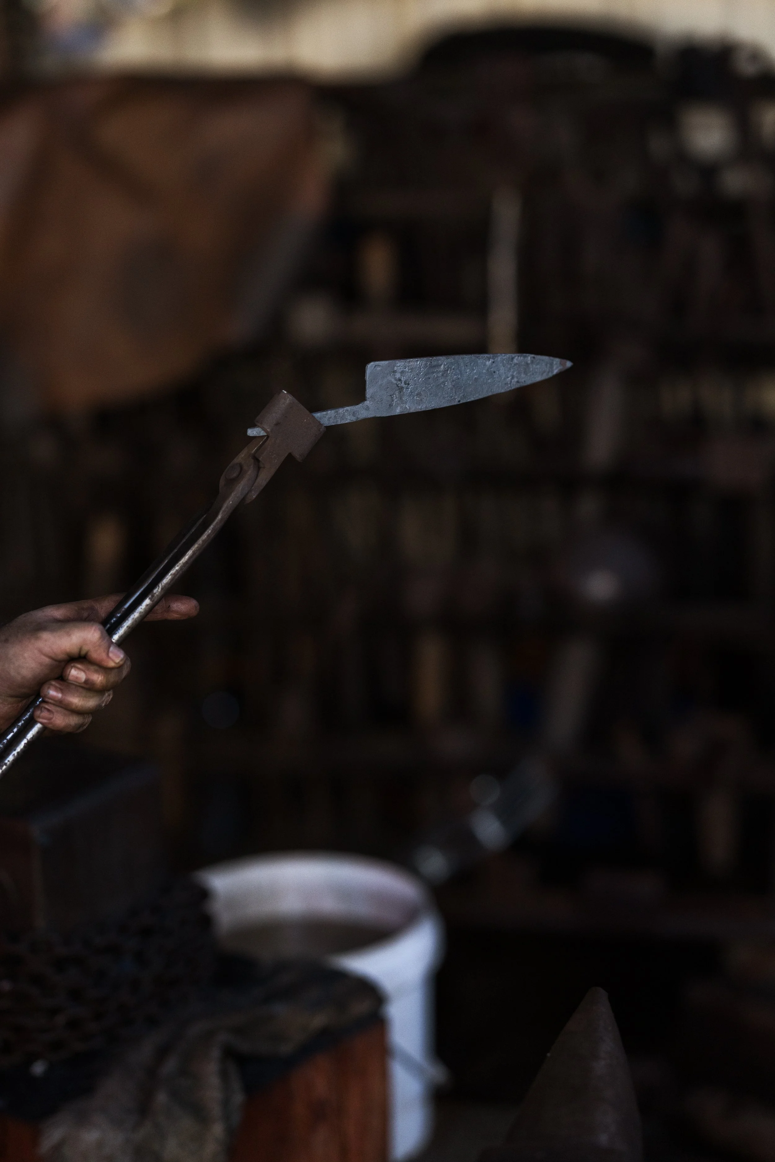 The shape of the tip is important for aesthetics and functionality. By this stage, the steel has been hammered to relatively thin proportions and will easily warp or crease. Light, accurate hammer work is needed. In this image you can see a good view of my smithy, with an antique British anvil and a range of tools. A bucket of water allows me to cool my tongs and other tools. Chains around my anvils serve to muffle the ringing as they are struck.